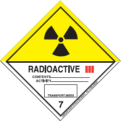 Hazard Class 7 Radioactive III White/Yellow Halved Label - Highly radioactive materials require a 1/2 white 1/2 yellow label with the radioactive trefoil at the top and words including "Radioactive III" and a Transport Index on the label. |